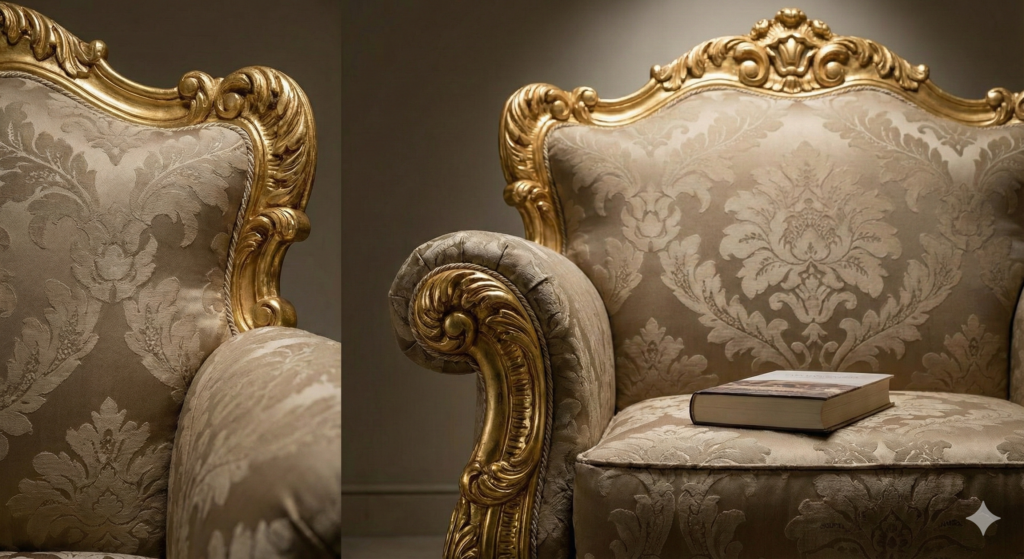 Scaling extends to the textiles and finishes applied to the frames. A damask pattern with a 30cm repeat, which looks substantial in a London townhouse, reads as a solid texture in a 200m² Riyadh salon. Modenese Furniture frequently utilizes fabrics with “grand rapport” designs—pattern repeats exceeding 70cm—to ensure the motif remains decipherable from a distance.