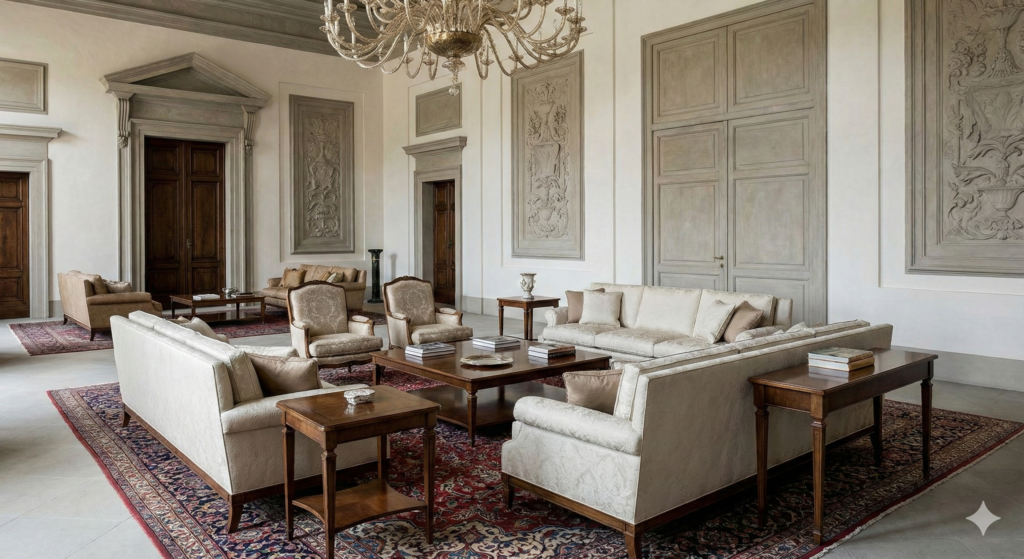 Designers utilize oversized italian rugs to define these floating zones. A rug in this context acts as a psychological boundary, replacing physical walls. The dimensions of these textiles must extend at least 40cm beyond the rear legs of the furniture grouping to create a cohesive island. If the rug is too small, the furniture appears to drift; if properly scaled, it locks the arrangement into the architectural grid.
